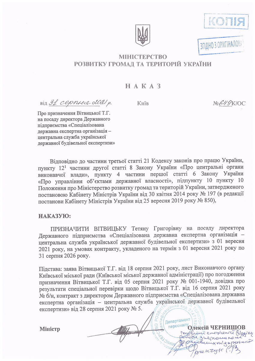 Про призначення Вітвицької Т.Г. на посаду директора Державного підприємства «Спеціалізована державна експертна організація – центральна служба української державної будівельної експертизи» (наказ МІНІСТЕРСТВА РОЗВИТКУ ГРОМАД ТА ТЕРИТОРІЙ УКРАЇНИ від 31 серпня 2021 року № 649 К/ОС)